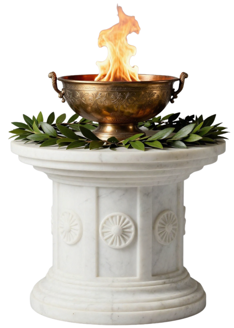 Here, I’ve reproduced that sense of reverence with a scene reminiscent of the temple’s sanctum: a bronze domed roof, a white marble encircling wall with fluted columns, and a vibrant flame burning inside a bronze firebowl.