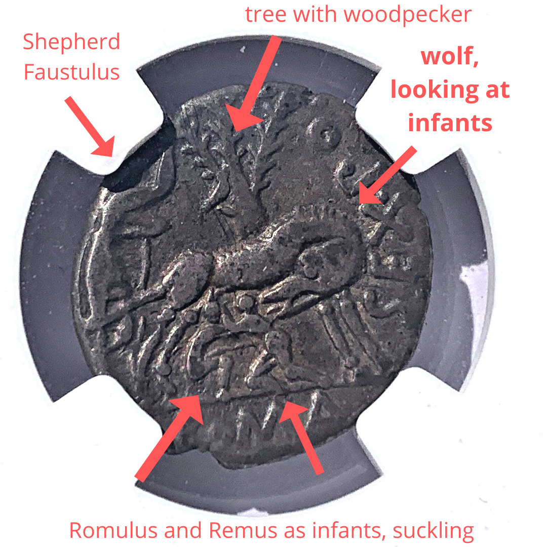A 2nd century BCE silver denarius of the she-wolf (or Lupa) nursing the twins Romulus and Remus, sons (by Mars) of the Vestal Virgin Rhea Silvia. The figure to the left is a rare image in coins of the shepherd Faustulus.